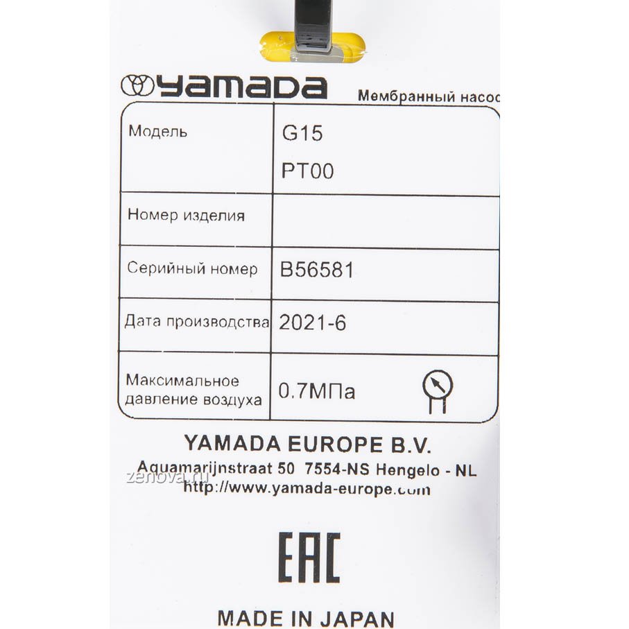 - Насос Yamada G15PT работает от энергии сжатого воздуха с давлением до 7 бар.