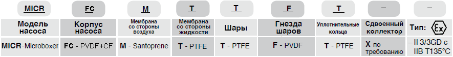MICROBOXER-F - это условное название модели, полный артикул насоса IMICRFCMTTFT--, он содержит информацию о материалах элементов конструкции.