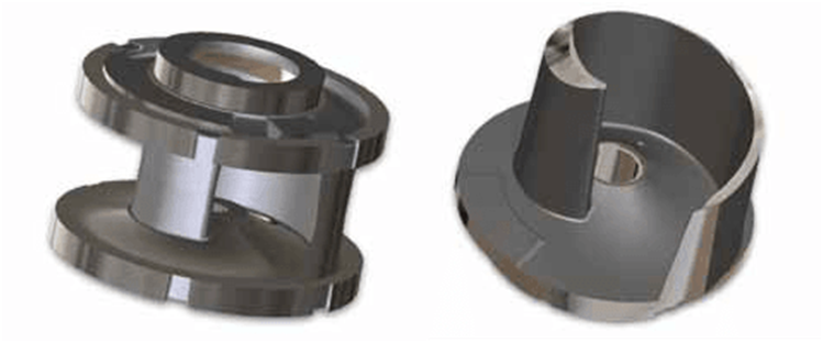 - Крыльчатка этих насосов может быть как открытого, так и закрытого типа. Подробнее о видах крыльчатки можно прочитать в разделе «Принцип действия и принципиальная схема дренажного насоса». Количество лопастей по сравнению с обычными центробежными насосами может быть уменьшено, чтобы препятствовать забиванию волокнистых измельченных фрагментов между лопастями. Также крыльчатки насосов с измельчителем имеют неспецифические для центробежных конструкций углы изгиба лопастей.