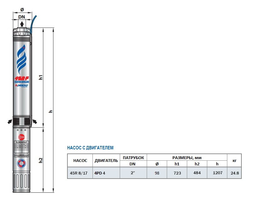 Габаритный чертеж насоса Pedrollo 4SR 8/17