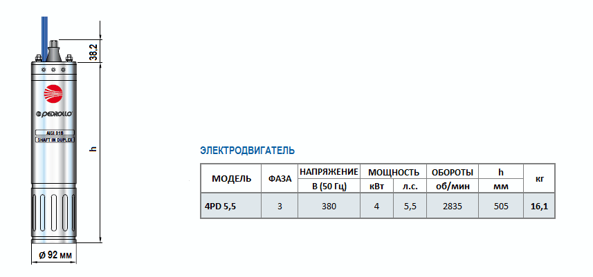 4PD 5,5 – 2835 об/мин (2P), трехфазная версия 380 В (50 Гц), мощность 4 кВт (5,5 л.с.)