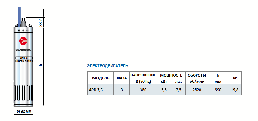 4PD 7,5 – 2820 об/мин (2P), трехфазная версия 380 В (50 Гц), мощность 5,5 кВт (7,5 л.с.)