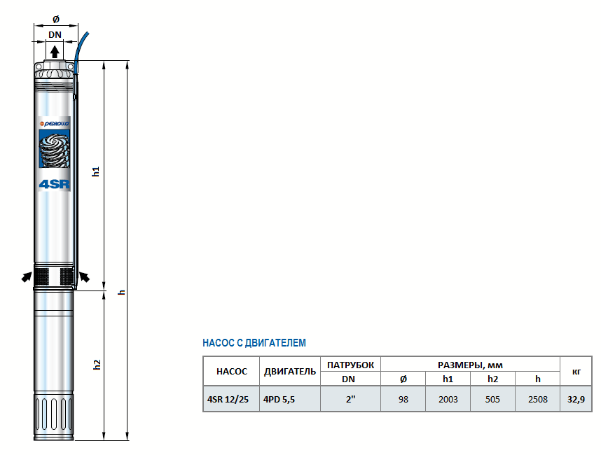 Габаритный чертеж насоса Pedrollo 4SR 12/25