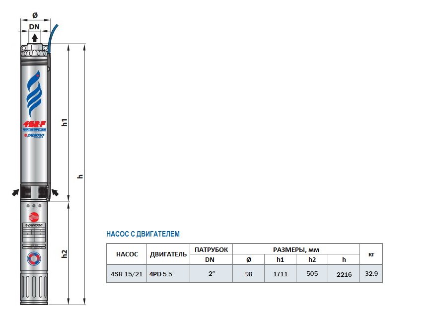 Габаритный чертеж насоса Pedrollo 4SR 15/21
