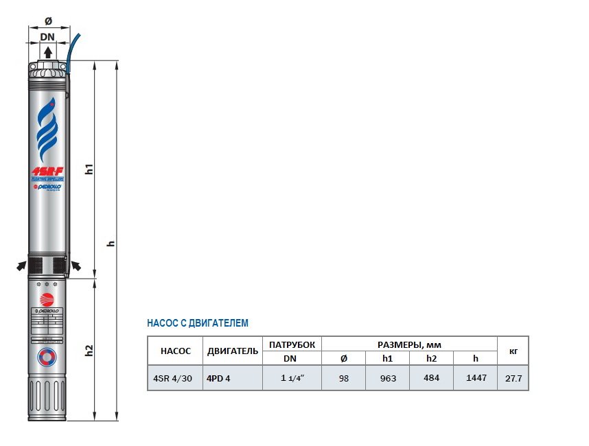 Габаритный чертеж насоса Pedrollo 4SR 4/30
