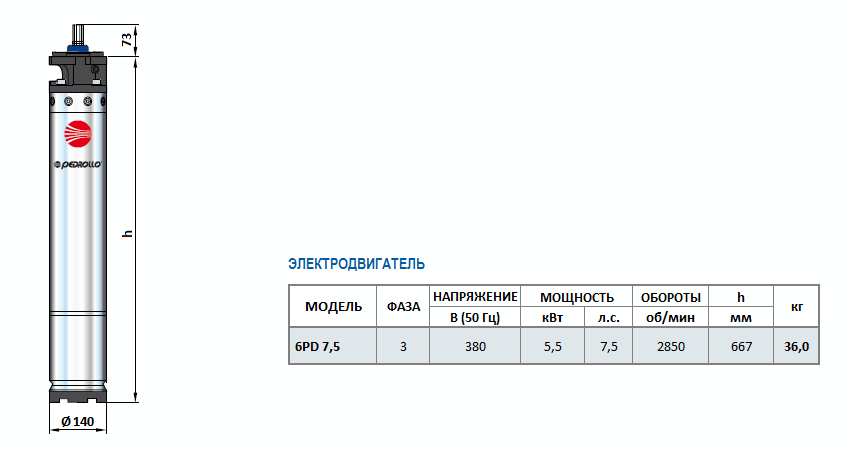 Габаритный чертеж насоса Pedrollo 6SR 12/11