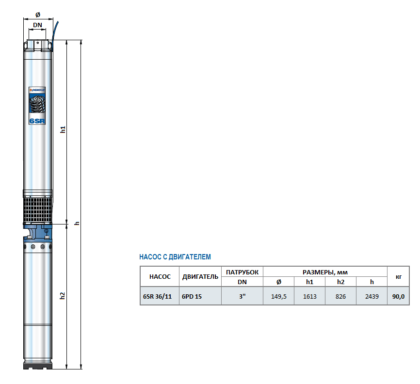 Габаритный чертеж насоса Pedrollo 6SR 36/11