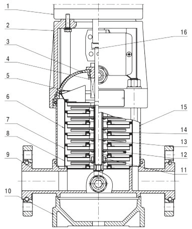Выходной вал двигателя соединяется с валом насоса через муфту. Насос состоит из рабочих ступеней (рабочее колесо, диффузор), установленных в цилиндрический корпус и соединенных при помощи стяжных болтов совместно с основанием или плитой и головой насоса. В основании имеются входной и выходной патрубки, расположенные на одной оси.