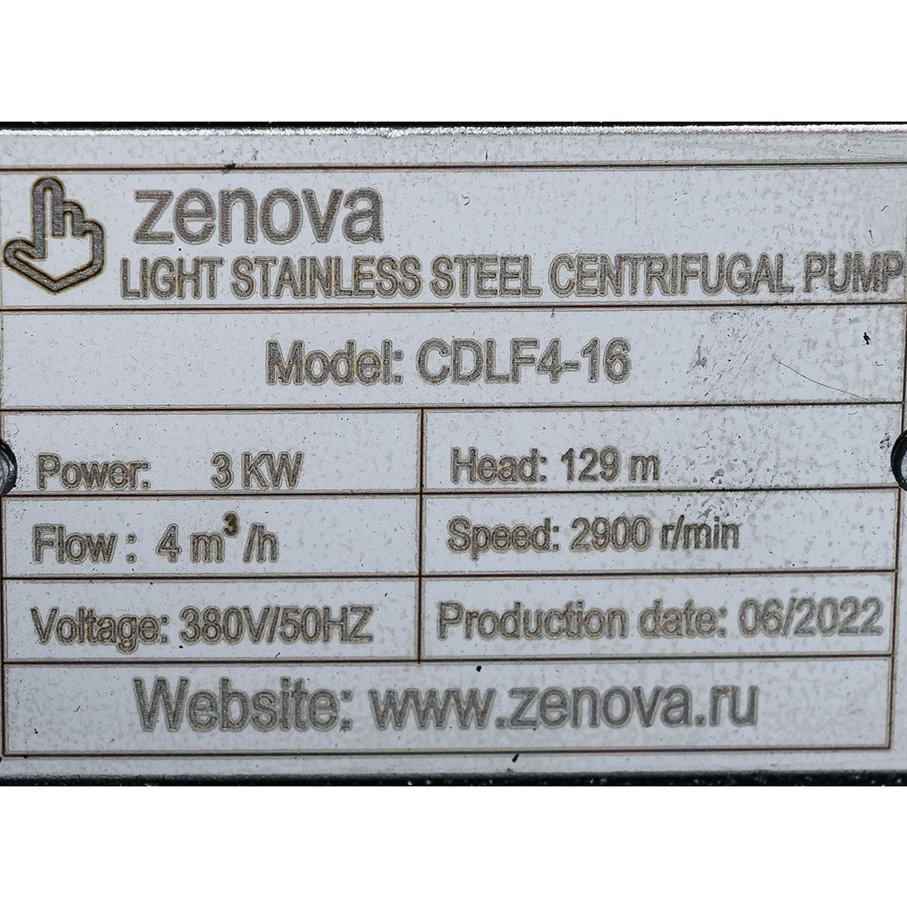 Насос Zenova CDLF 4-16 - вертикальный многоступенчатый насос высокого давления, который производится на современном заводе в Китае и продается в России под нашей собственной маркой Zenova. Насос имеет 16 рабочих ступеней. Патрубки насоса одинакового диаметра 32 мм, расположены на одной линии. Голова насоса выполнена из чугуна, внутренние части, контактирующие с водой, изготовлены из нержавеющей стали AISI 304. Модель предназначена для перекачивания чистой жидкости без твердых частиц, подходящей для нержавеющей стали.