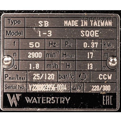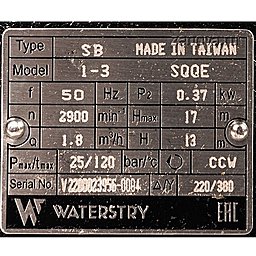 Насос оснащен асинхронным трехфазным двигателем 380 В/50 Гц, 2 полюса, 2900 об/мин. Номинальная мощность двигателя 0,37 кВт. Класс изоляции B, класс защиты IP 68.