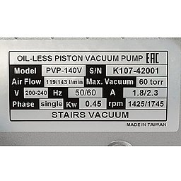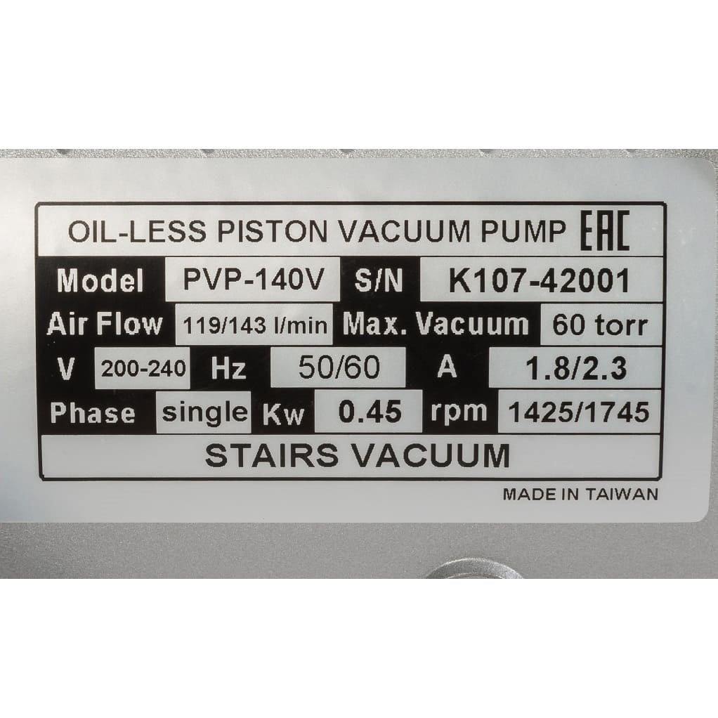 Поршневой вакуумный насос Stairs Vacuum PVP-140V – это одноступенчатый двухкамерный насос для откачивания закрытых объемов воздуха до остаточного давления 80 мбар. Насос очень компактен, не требует заправки вакуумным маслом, используется в приложениях, где важно, чтобы воздух на выходе оставался чистым и безопасным. Страна производства насоса Тайвань.