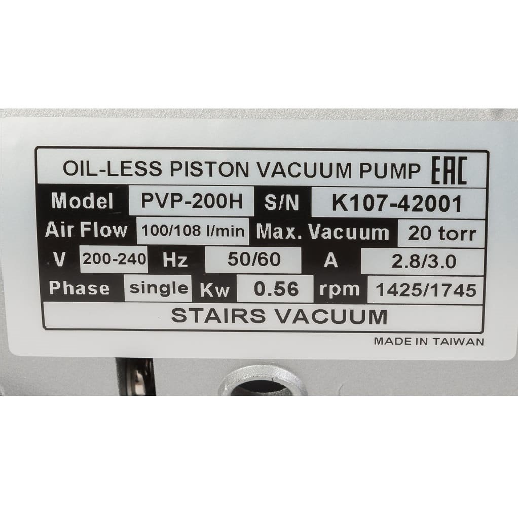 Поршневой вакуумный насос Stairs Vacuum PVP-200H – это двухступенчатый двухкамерный насос для откачивания закрытых объемов воздуха до остаточного давления 27 мбар. Насос очень компактен, не требует заправки вакуумным маслом, используется в приложениях, где важно, чтобы воздух на выходе оставался чистым и безопасным. Страна производства насоса Тайвань.