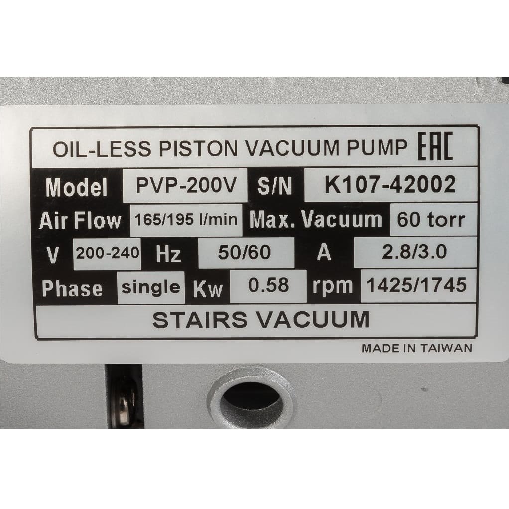 Поршневой вакуумный насос Stairs Vacuum PVP-200V – это одноступенчатый двухкамерный насос для откачивания закрытых объемов воздуха до остаточного давления 80 мбар. Насос очень компактен, не требует заправки вакуумным маслом, используется в приложениях, где важно, чтобы воздух на выходе оставался чистым и безопасным. Страна производства насоса Тайвань.