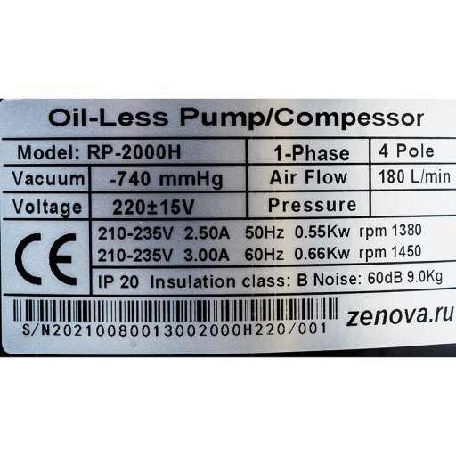Поршневой вакуумный насос Zenova RP-2000H-220 – это двухступенчатый насос для откачивания закрытых объемов воздуха до остаточного давления 30 мбар.