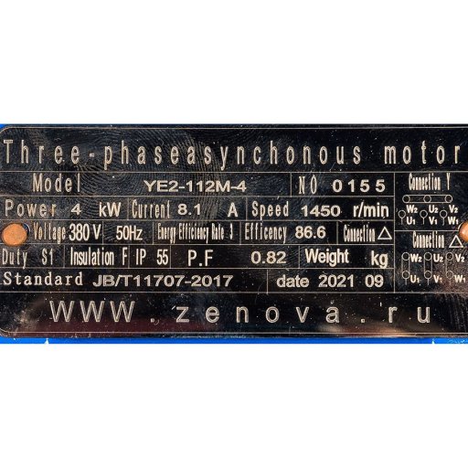 Двигатель мощностью 4 кВт, 3Ф~, 380 В (50 Гц), номинальная скорость 1450 об/мин (4Р). Требуемое подключение — треугольник.