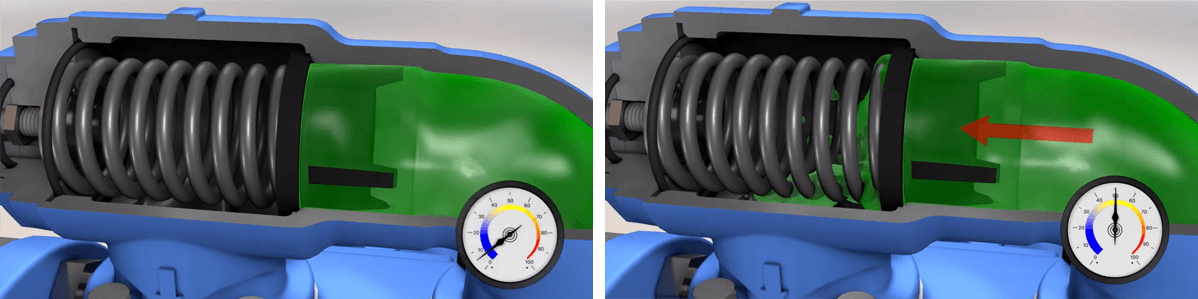 Рис. 4 – Схема работы байпасного клапана. Слева – давление в напорной линии в пределах нормы, клапан закрыт. Справа – давление в напорной линии выше нормы, перекачиваемая жидкость сильнее давит на клапан, в результате чего он открывается