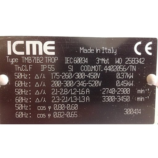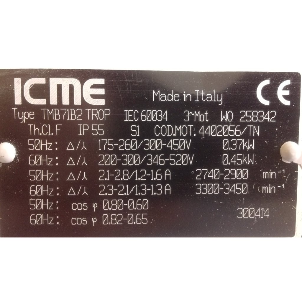 Электротехнические данные двигателя насоса – 3 фазы/380 В/50 Гц, 2800 об/мин, мощность 0,45 кВт.
