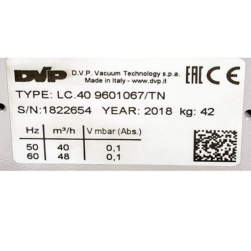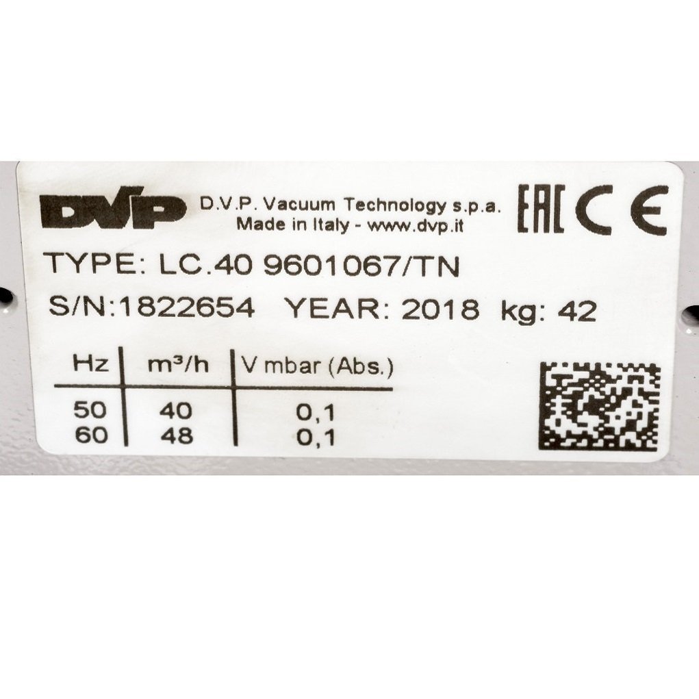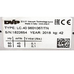 LC.40 оснащен обратным клапаном, фильтром масляного тумана, масловозвратным клапаном, газобалластным устройством с отсечным клапаном "ON/OFF", масляным фильтром с байпасом, виброгасителями. Насос производится итальянской компанией D.V.P. Vacuum Technology s.p.a, заводской номер модели 9601067.