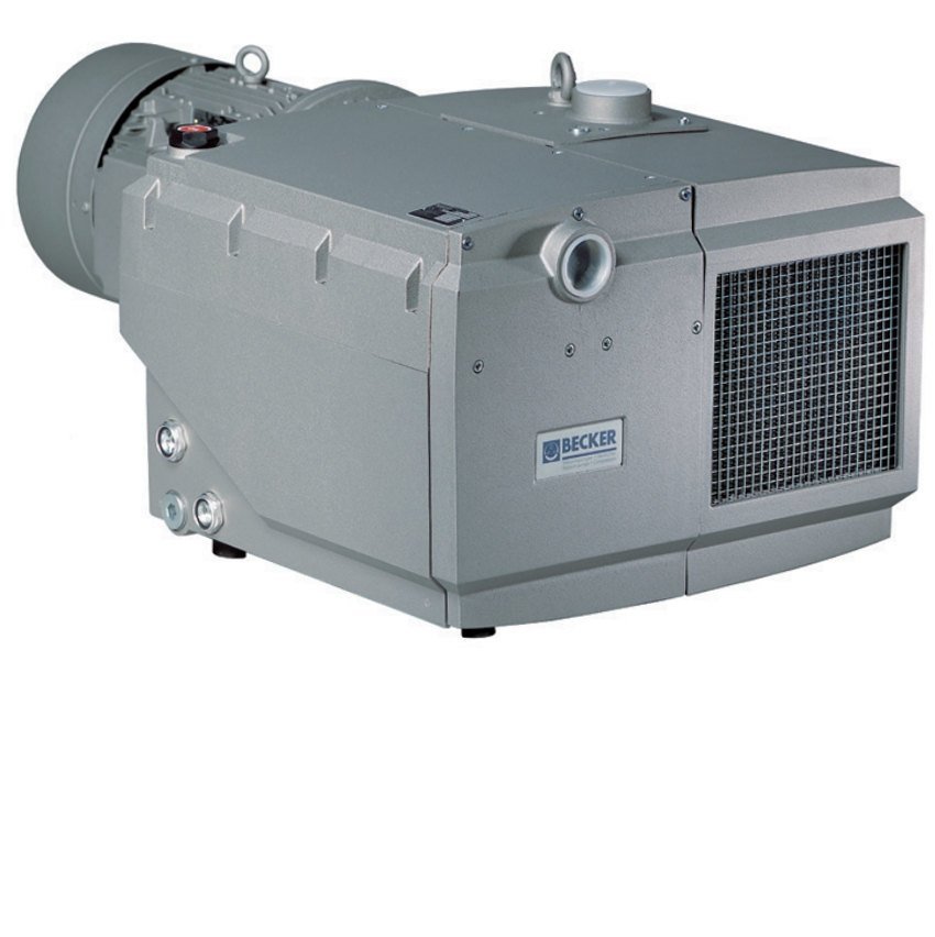 Модель Becker U 4.165 SA/K откачивает воздух и неагрессивные газы из вакуумируемой емкости со скоростью от 1 до 162 м3/час до предельного вакуума 3 мбар (2,3 мм рт. столба). Требуемый объем масла 7 литров.