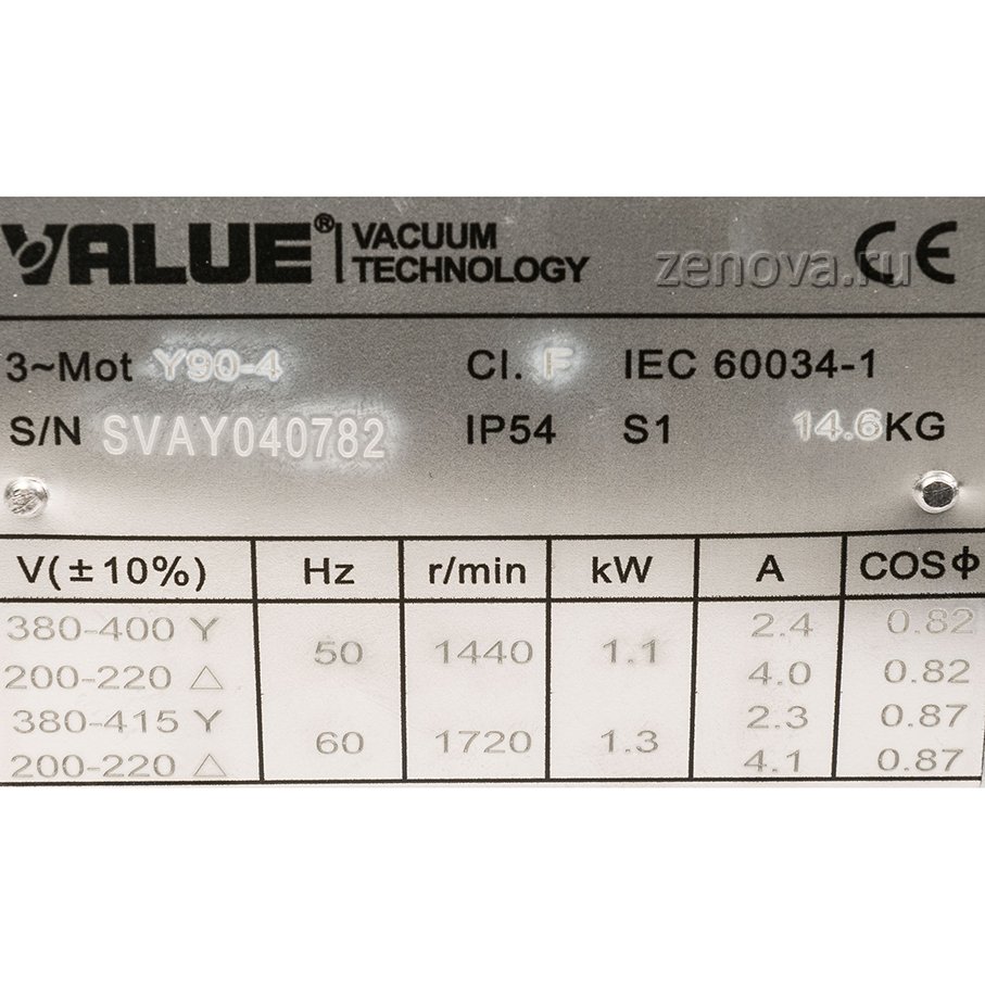 Моноблочный пластинчато-роторный насос Value VSV-028 создает вакуум в закрытых емкостях. Максимальный расход воздуха составляет 28 м³/час. Насос позволяет добиться достаточно глубокого вакуума. Остаточное давление с выключенным газобалластом составляет 0,3 мбар. При газобалласте в положении №1 остаточное давление составляет 0,5 мбар, а при газобалласте в положении №2 остаточное давление 1,5 мбар.