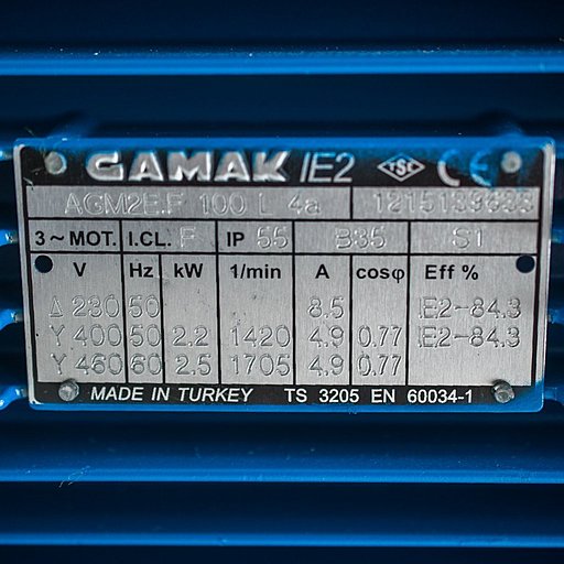 Насос оснащен четырехполюсным электродвигателем европейского стандарта IEC мощностью 2,2 кВт, 1450 оборотов в минуту.