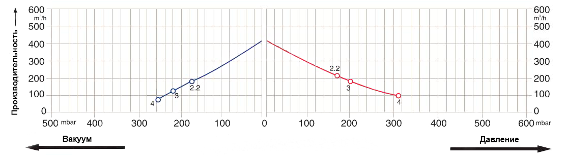 В вытяжном (вакуумном) режиме создает разрежение до -260 мбар. При таком разрежении расход воздуха 80 м³/час.