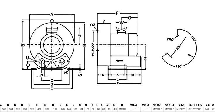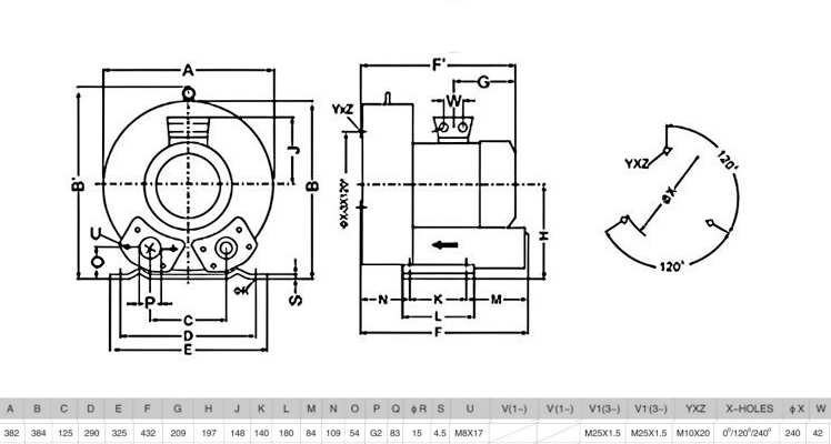 Входной и выходной патрубки воздуходувки обращены назад. Диаметр присоединения G 2" (50 мм).
