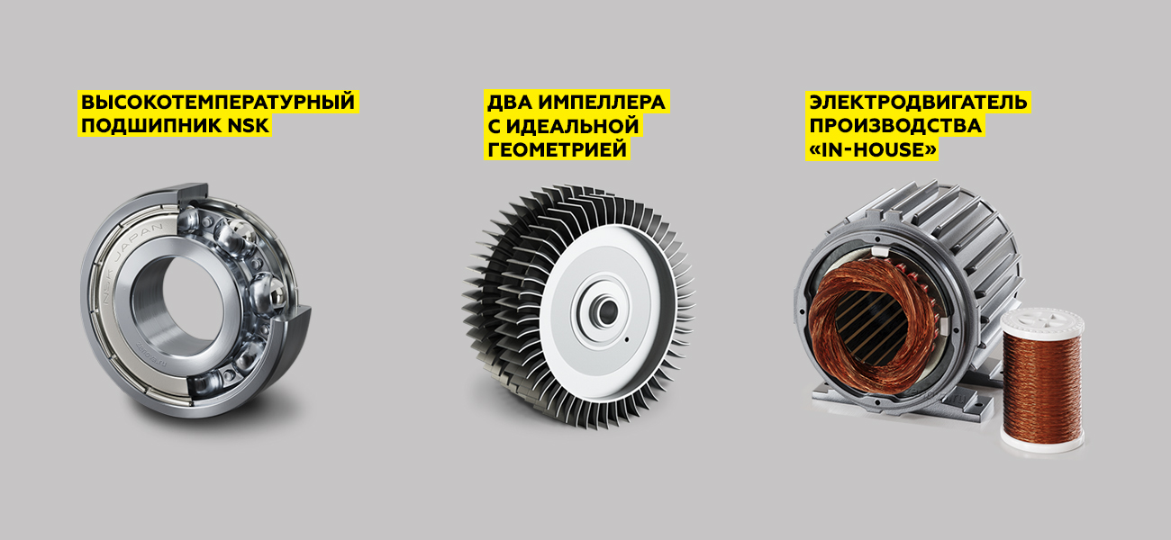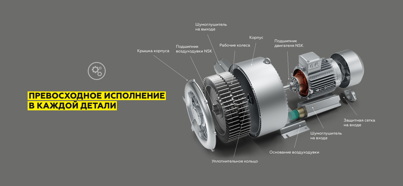 У этой воздуходувки два рабочих колеса, и оба работают как первая ступень. Это обеспечивает удвоенную производительность при сохранении достаточного давления.