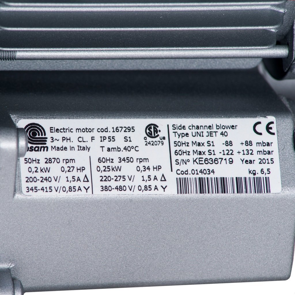 - Воздуходувка UNIJET 40 оснащена трехфазным электродвигателем мощностью 0,2 кВт на 2900 об/мин.