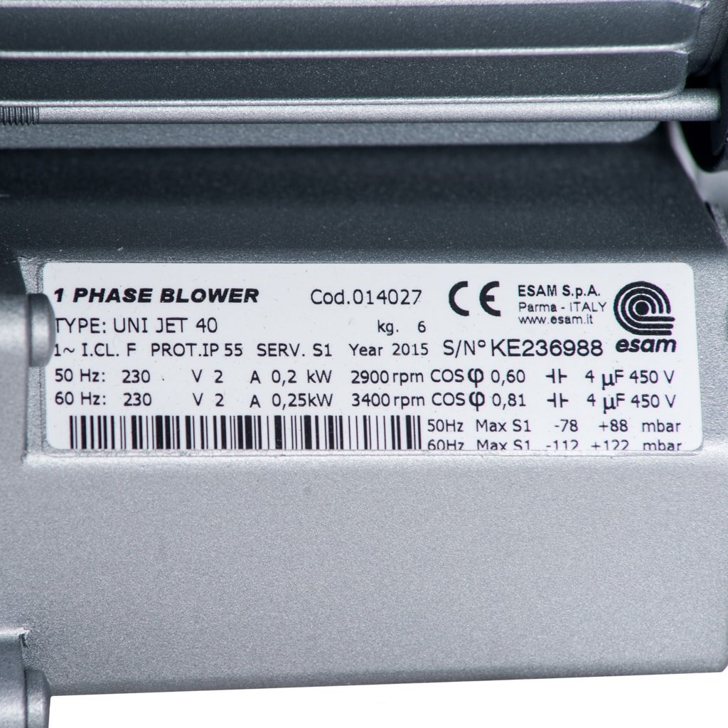 Модель UNIJET 40_220 (производство Италия) - это самая маленькая воздуходувка в модельном ряду фирмы Esam. Диаметр патрубков всего 25 мм (1 "), а вес 7 килограмм. Крошечные размеры позволяют использовать ее в качестве составного элемента различных станков и прочего оборудования.