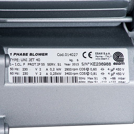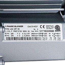 - Воздуходувка UNIJET 40_220 оснащена однофазным электродвигателем мощностью 0,2 кВт на 2900 об/мин.