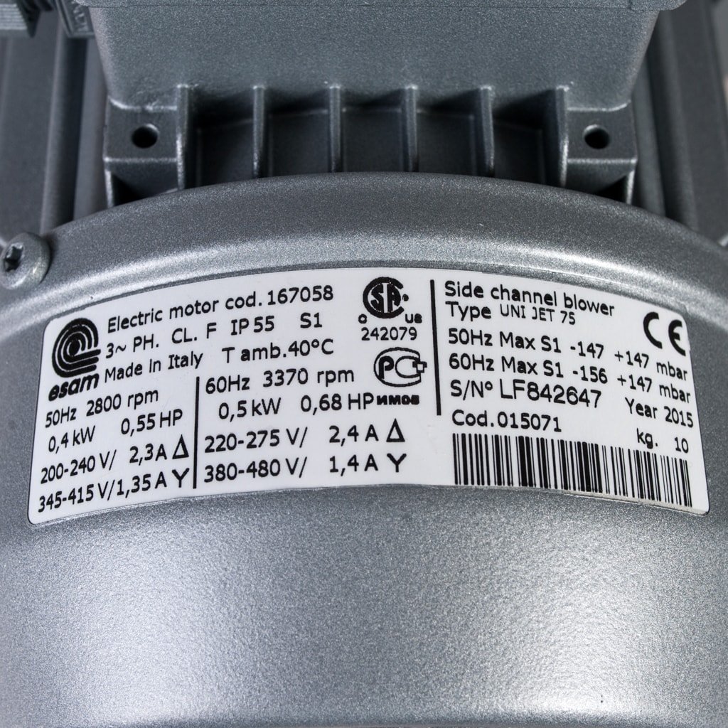 Воздуходувка UNIJET 75 оснащена трехфазным электродвигателем мощностью 0,4 кВт на 2900 об/мин.