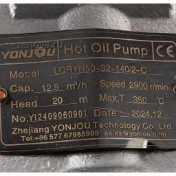 Центробежный насос LQRYN 50-32-140 китайской фирмы YonJou (ZY Technology) специально спроектирован для перекачивания горячего масла температурой до +350 °C (кратковременно до +370 °C). Он может перекачивать горячую жидкость без необходимости подвода дополнительного охлаждения благодаря использованию дополнительного набивного графитового уплотнения и камеры отвода тепла для защиты механического уплотнения от перегрева.
