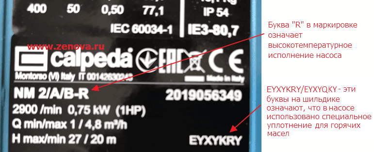 Наши покупатели при получении насоса NM R5 часто задают нам вопрос точно ли он рассчитан на горячее масло. Дело в том, что производитель кладет в коробку с высокотемпературным насосом инструкцию от обычных насосов для воды серии NM. Это и сбивает людей с толку. Однако чтобы убедиться в правильности модели насоса, достаточно взглянуть на его шильдик: