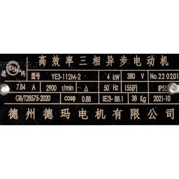 Мощность 4 кВт, количество оборотов 2900 об/мин (2 пары полюсов), 3Ф ~, напряжение 380 В, частота 50 Гц.