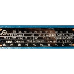 Мощность 11 кВт, количество оборотов 2900 об/мин (2 пары полюсов), 3Ф ~, напряжение 380 В, частота 50 Гц.