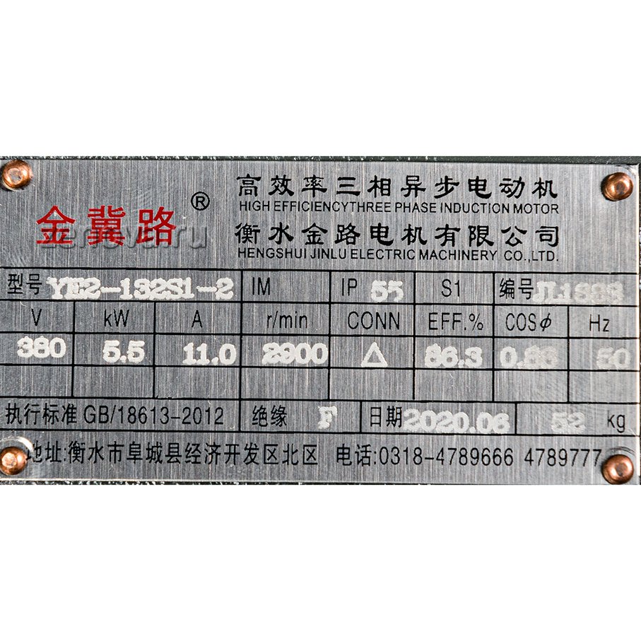 Мощность 5,5 кВт, количество оборотов 2900 об/мин (2 пары полюсов), 3Ф ~, напряжение 380 В, частота 50 Гц.