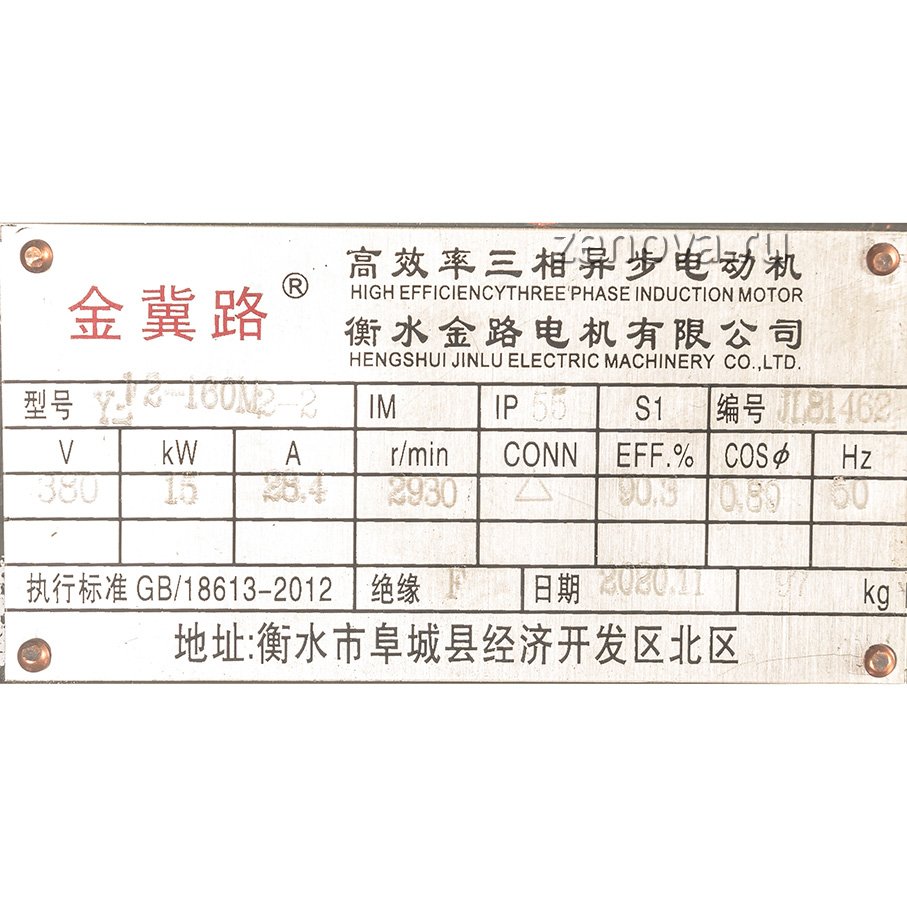 Мощность 15 кВт, количество оборотов 2900 об/мин (2 пары полюсов), 3Ф ~, напряжение 380 В, частота 50 Гц.