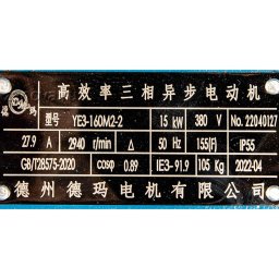 Мощность 15 кВт, количество оборотов 2900 об/мин (2 пары полюсов), 3Ф ~, напряжение 380 В, частота 50 Гц, класс энергоэффективности IE3.