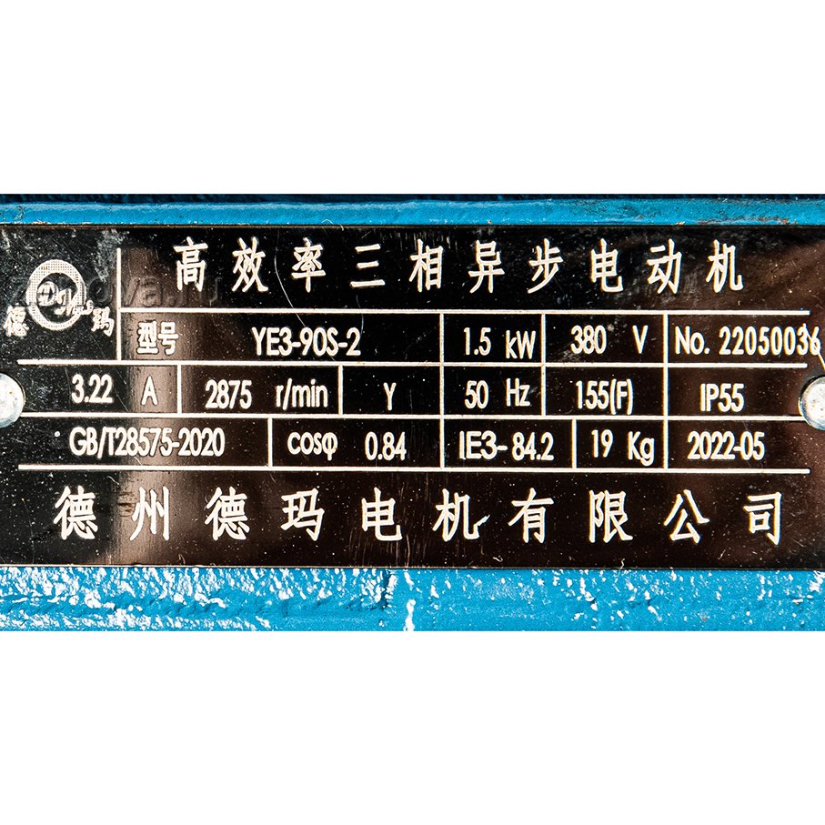 Мощность 1,5 кВт, количество оборотов 2900 об/мин (2 пары полюсов), 3Ф ~, напряжение 380 В, частота 50 Гц, класс энергоэффективности IE3.