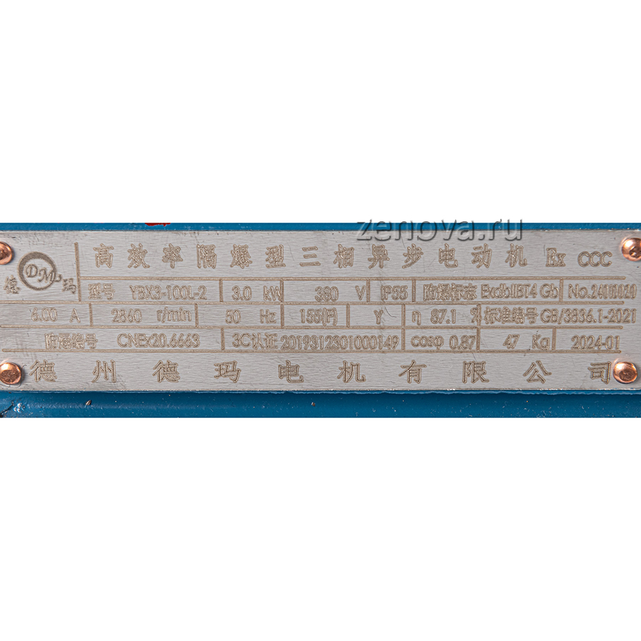 Мощность 3 кВт, количество оборотов 2900 об/мин (2 пары полюсов), 3Ф ~, напряжение 380 В, частота 50 Гц, класс энергоэффективности IE3.