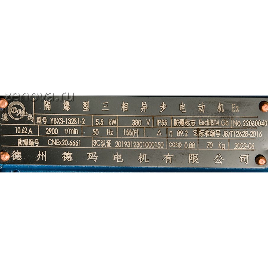 Мощность 5,5 кВт, количество оборотов 2900 об/мин (2 пары полюсов), 3Ф ~, напряжение 380 В, частота 50 Гц, класс энергоэффективности IE3.