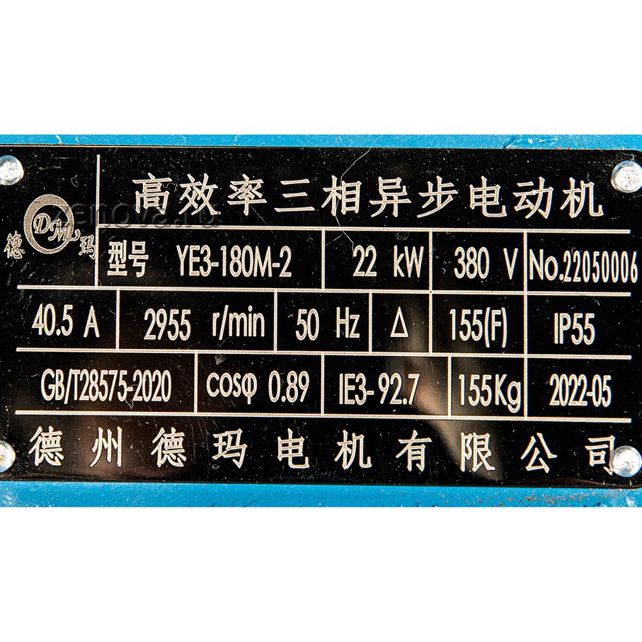 Мощность 22 кВт, количество оборотов 2900 об/мин (2 пары полюсов), 3Ф ~, напряжение 380 В, частота 50 Гц, класс энергоэффективности IE3.